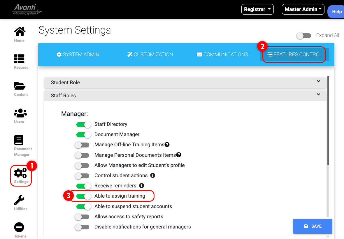 - In Staff Roles, scroll to find the Manager Role then toggle “Able to assign training” option is turned ON.
