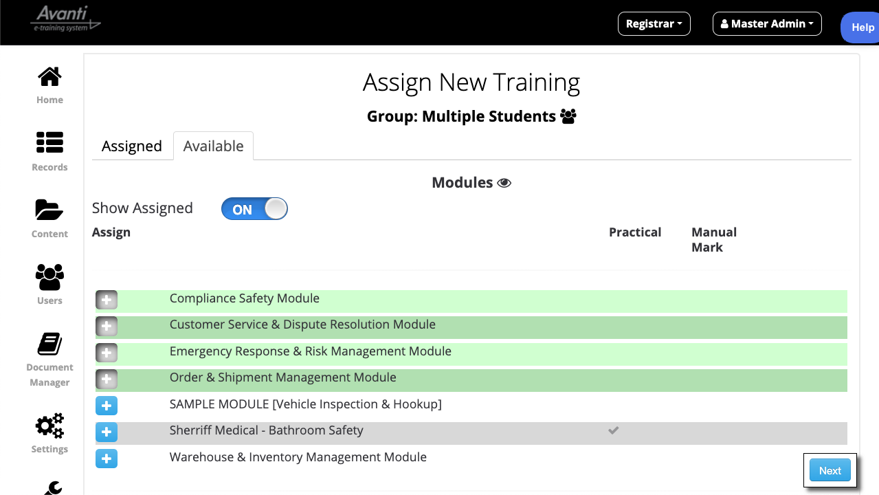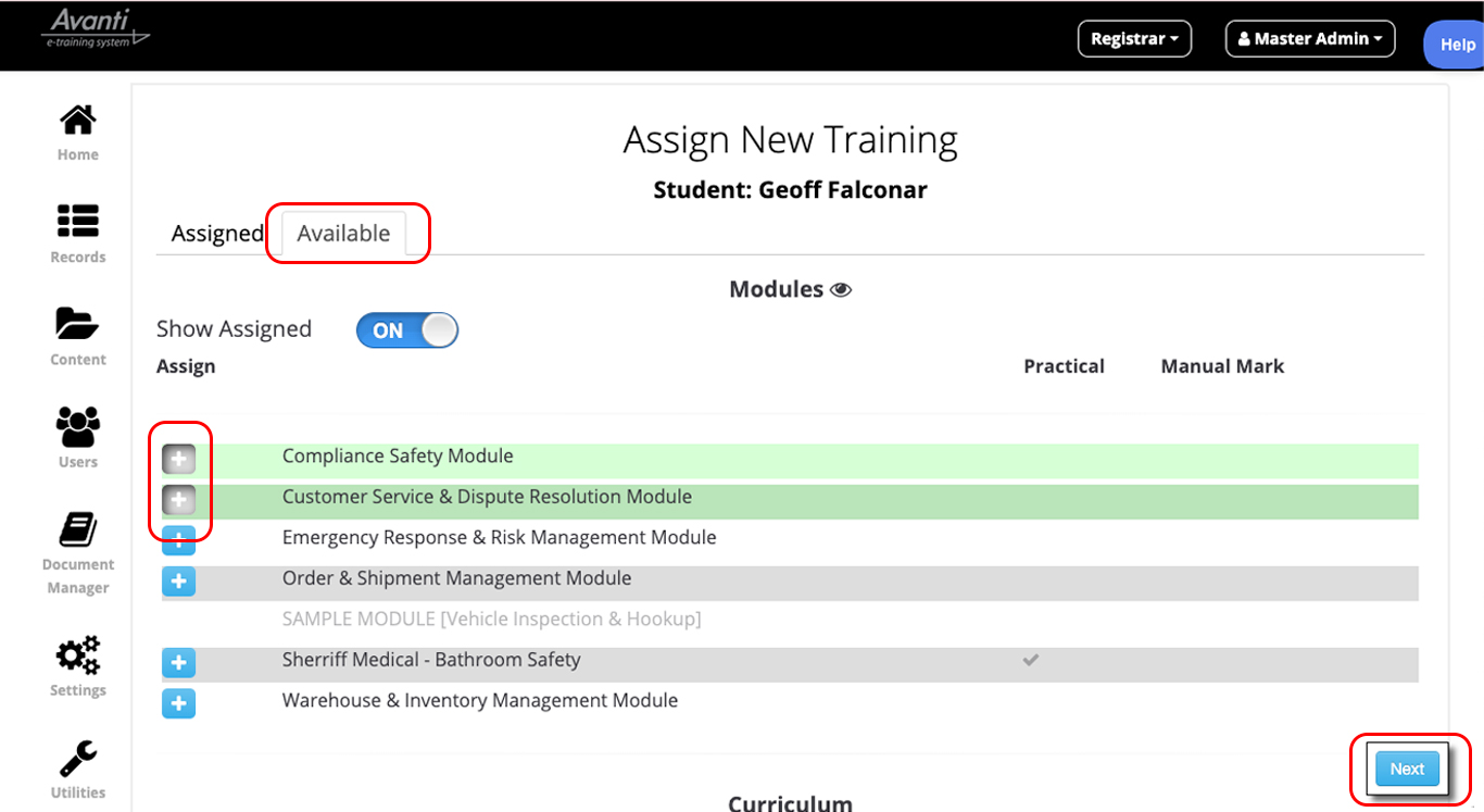- Once you have selected all the Modules and Curriculums you want to assign that student, click the blue ‘ Next’ button at bottom of page.