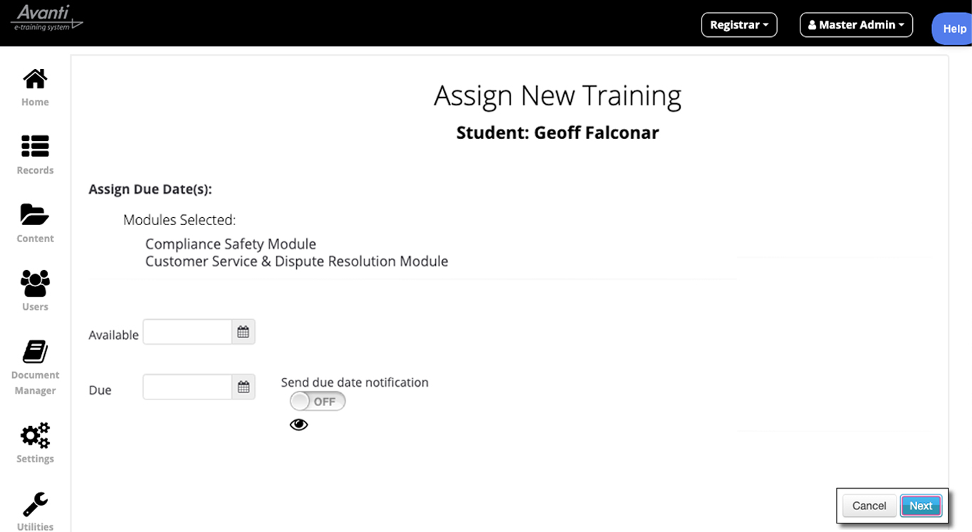- If you want to set a Due Date that this training needs to be completed by, click in the ‘ Due’ calendar picker and select the Due Date.