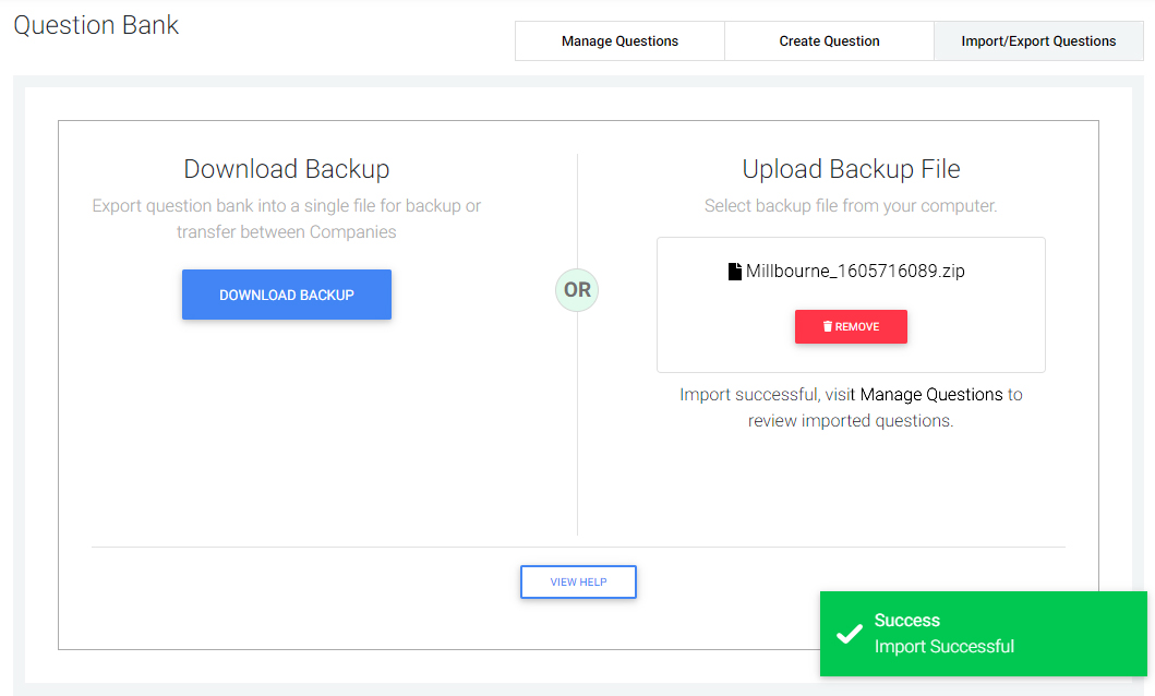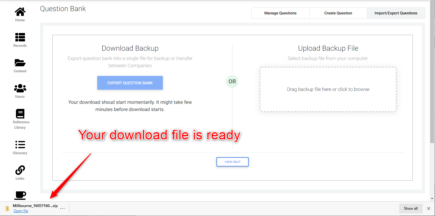 Once on the “Import/Export Questions” page, click on the “Download Backup” button.