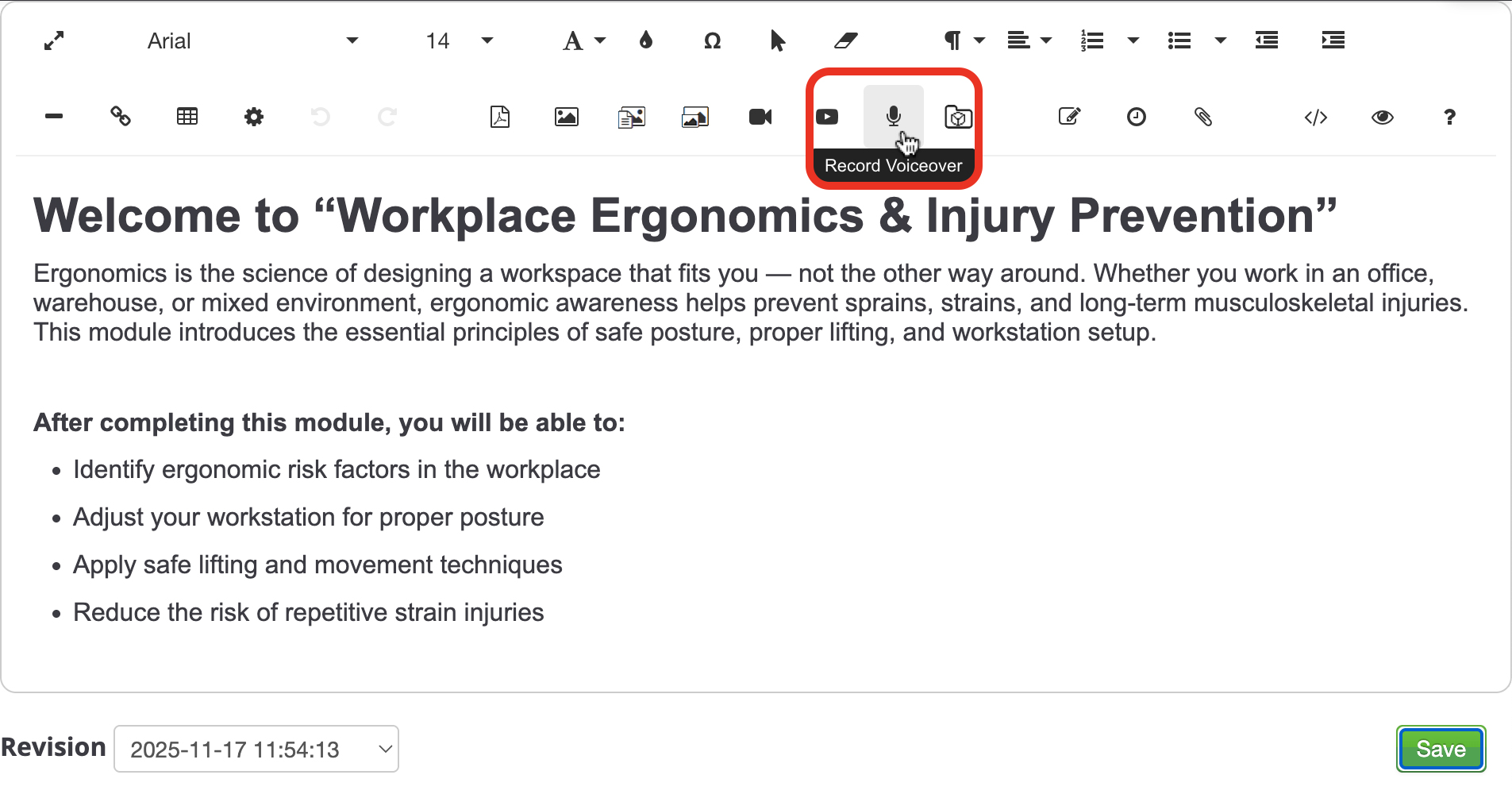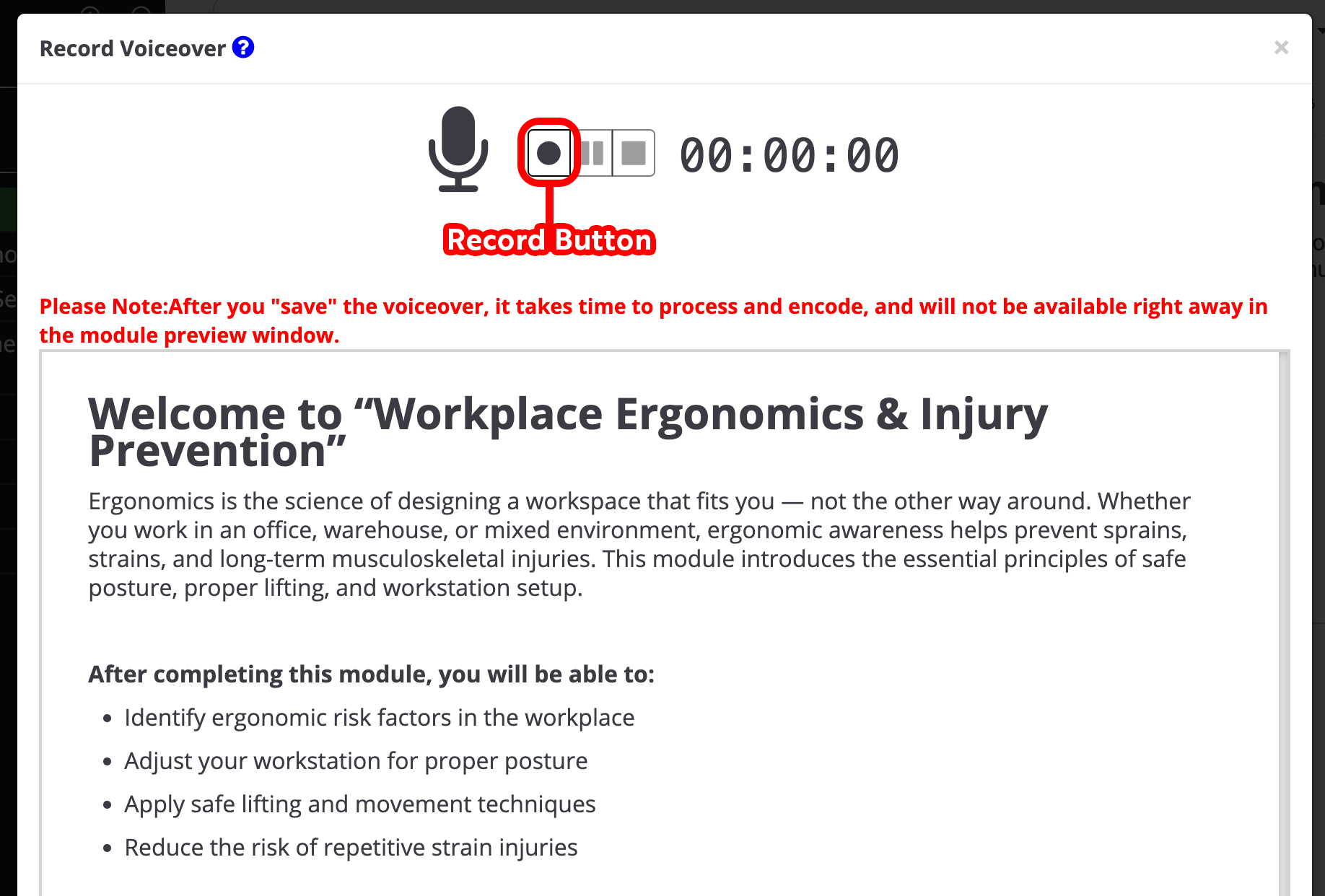 IMPORTANT: When you are finished adding or removing a voiceover on a page, you MUST click SAVE at the bottom of that page. Depending on the size of your page within the module, you may need to scroll to see the SAVE button.