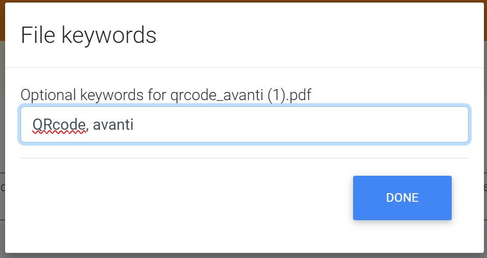 The pop-up will display the name of the file and its filetype. Below that, you have the option to add keywords or simply click "Done" to proceed without adding keywords.