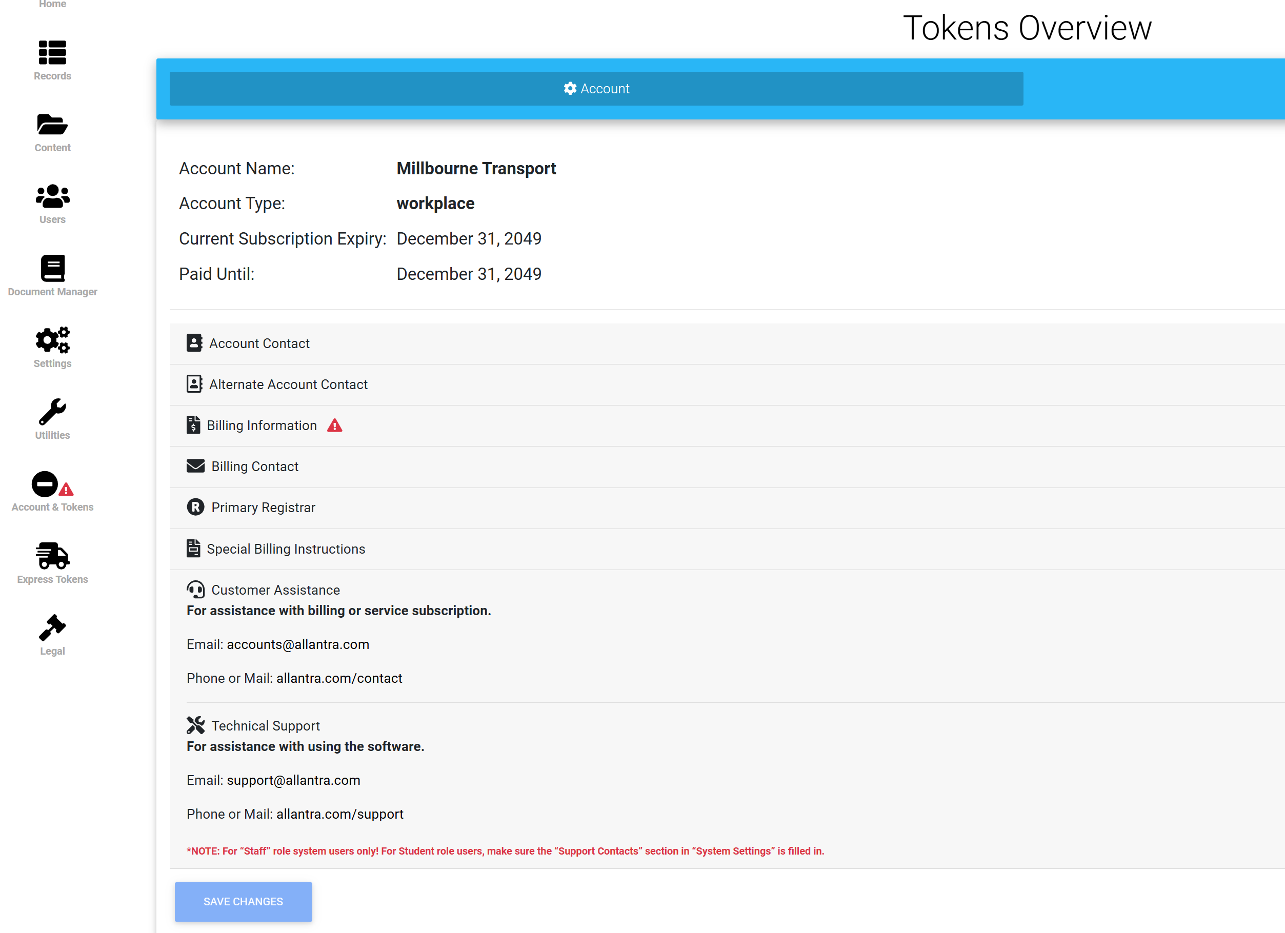 Note: If you notice a caution symbol located on your left-hand panel's 'Account & Tokens' button, please update the billing information section and click SAVE CHANGES. Once its updated the caution symbol will disappear.